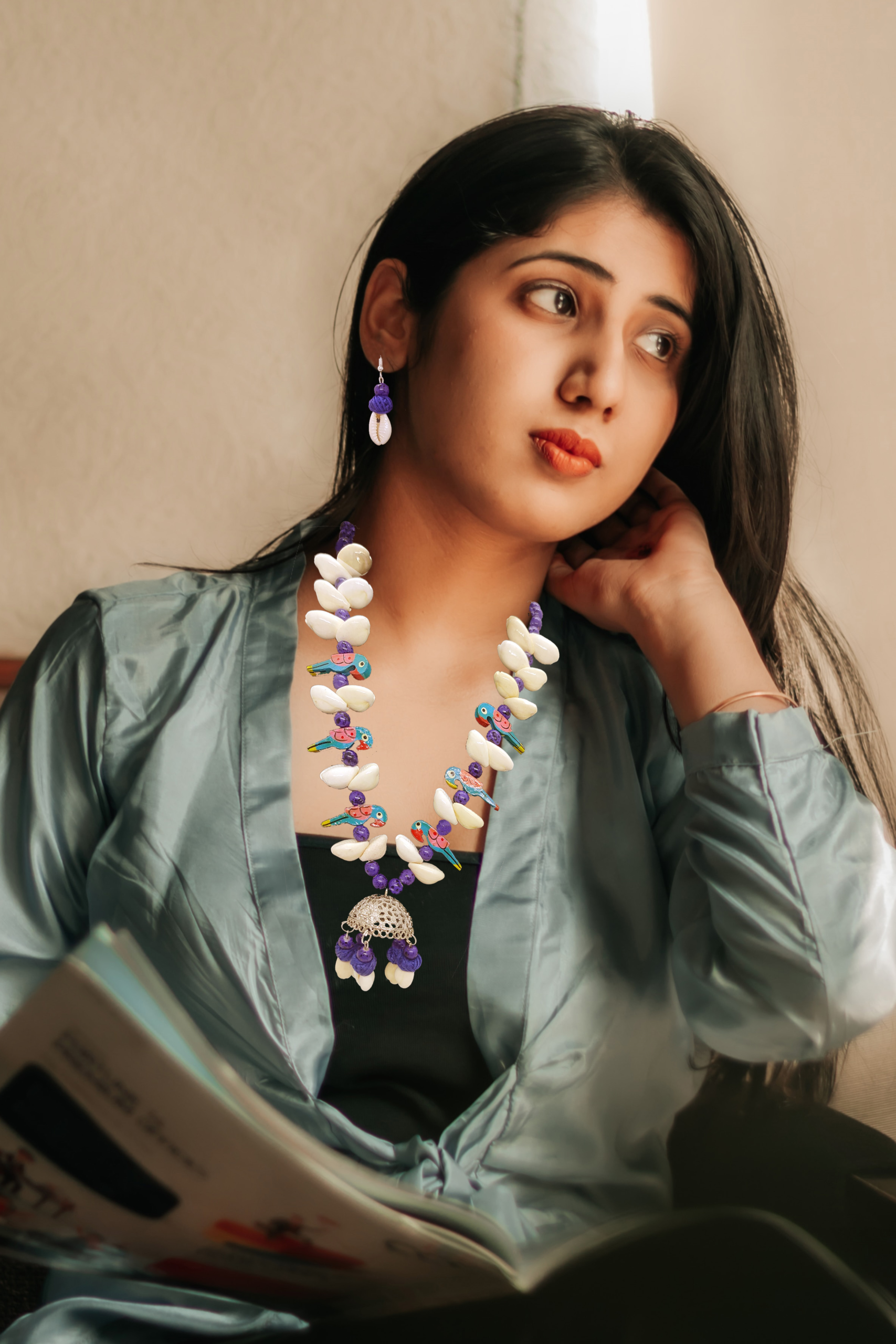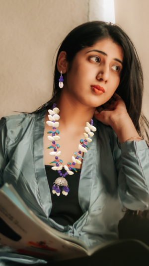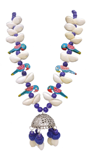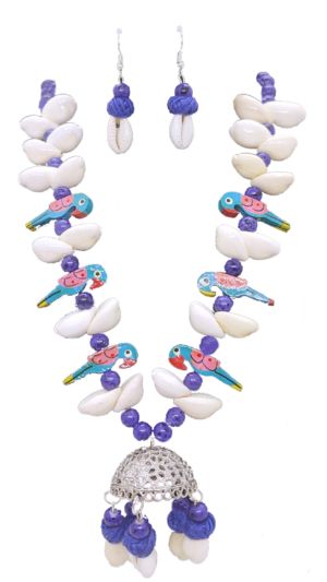 The captivating blue oxidised necklace is adorned with delicate shell work, each piece carefully placed to capture the essence of the parrot’s feathers. The matching earrings complement the set, adding a touch of elegance to your look.