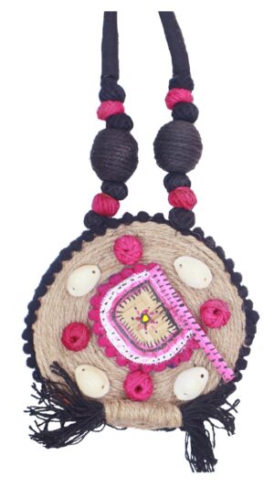 Introducing our stunning fan-shaped multicolor necklace and earrings set, a masterpiece of artistry and design. This unique set effortlessly combines the rustic charm of jute with the delicate beauty of shell work, resulting in a captivating accessory that’s sure to turn heads.