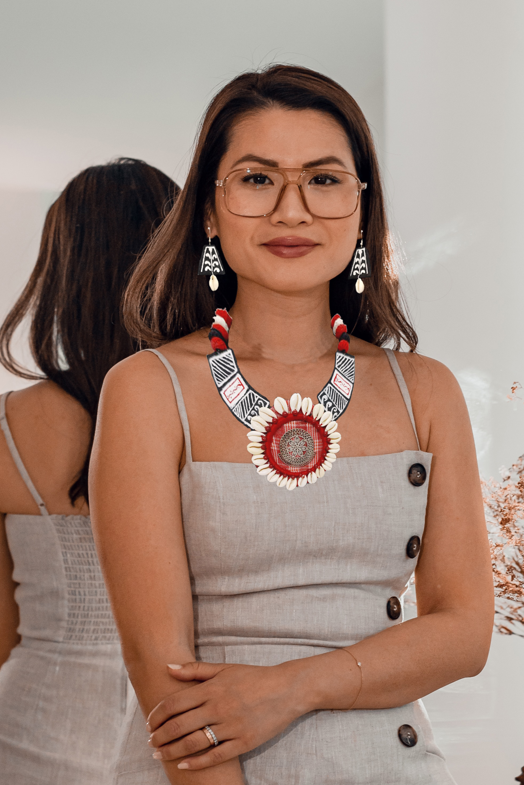 Complementing the necklace, the coordinating earrings frame your face with a harmonious blend of elements, showcasing the delicate artistry of shell work. The shell accents add a touch of natural sophistication, evoking the soothing ambiance of the ocean.