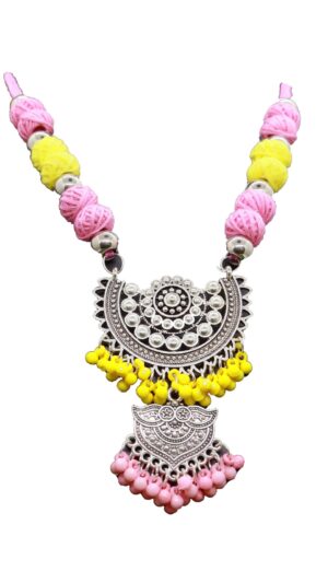 Meticulously curated, this set seamlessly marries the allure of oxidised finish with the vibrancy of multicolour design. The necklace and earrings harmonize effortlessly, allowing you to effortlessly infuse your ensemble with a burst of artistic charm.