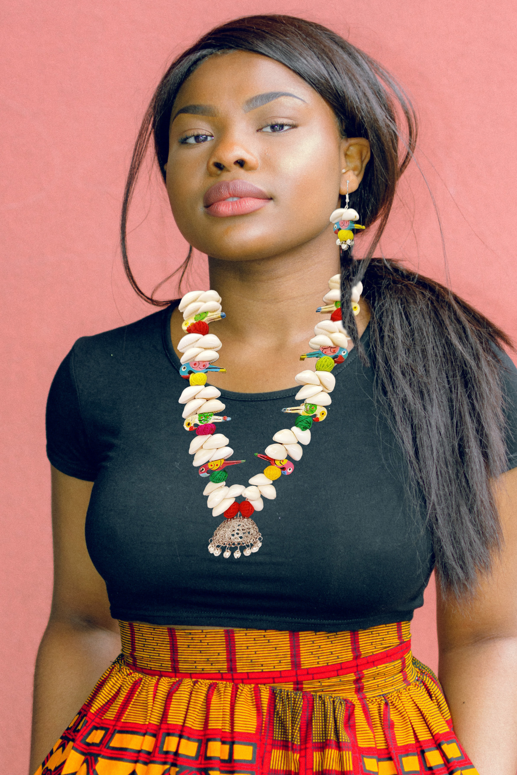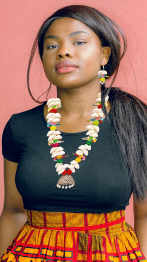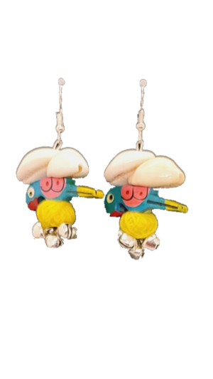 Adding an extra touch of allure, delicate shell work embellishes the set, offering a subtle yet striking contrast to the wooden and metal elements. The earrings echo the necklace’s charm, with miniature parrot motifs and matching beads, creating a coordinated and cohesive look.
