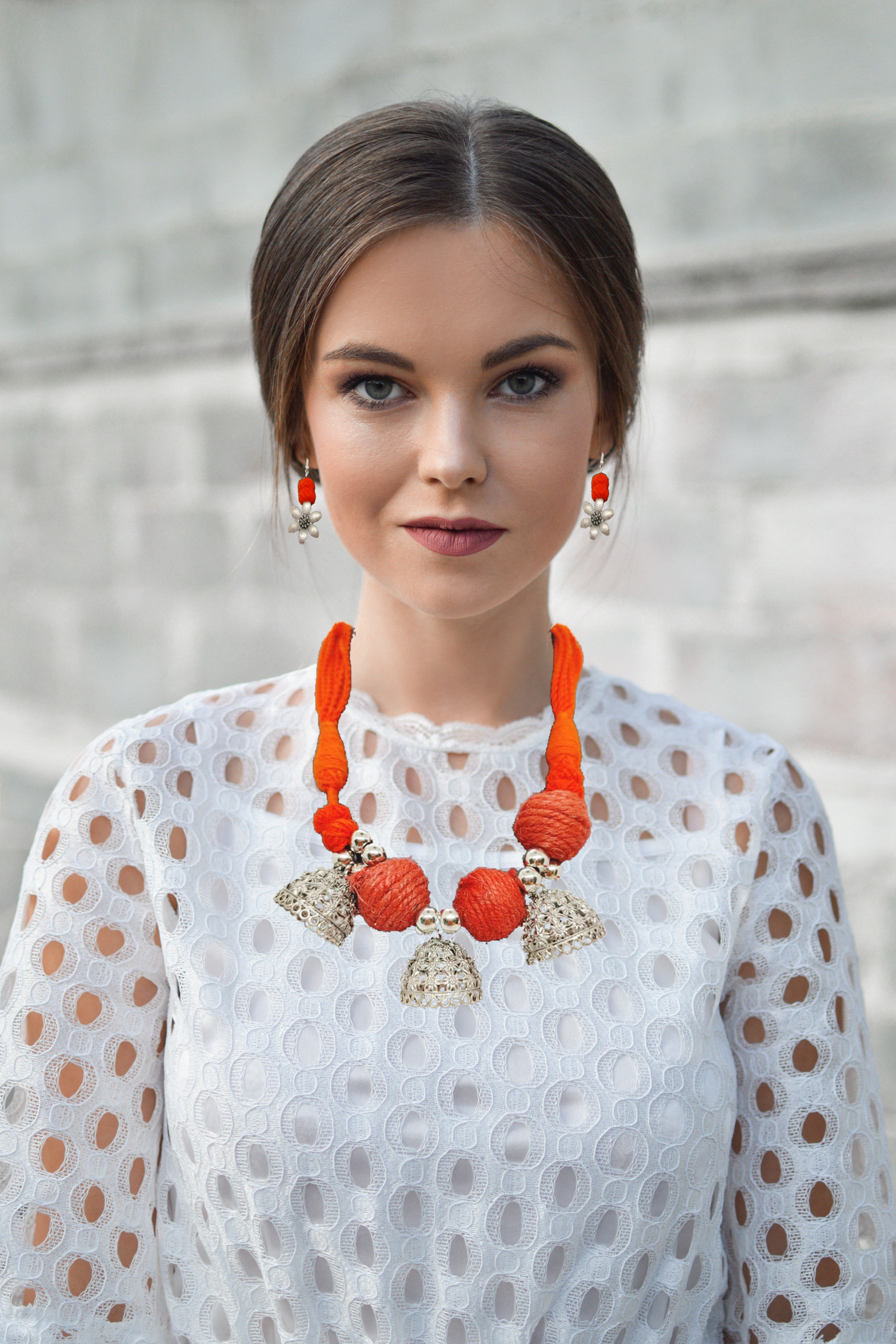 The necklace elegantly drapes around your neck, its oxidized tones adding depth and intrigue to your ensemble. The coordinating earrings complement your look, framing your face with a delicate balance of textures and hues, creating a captivating focal point.