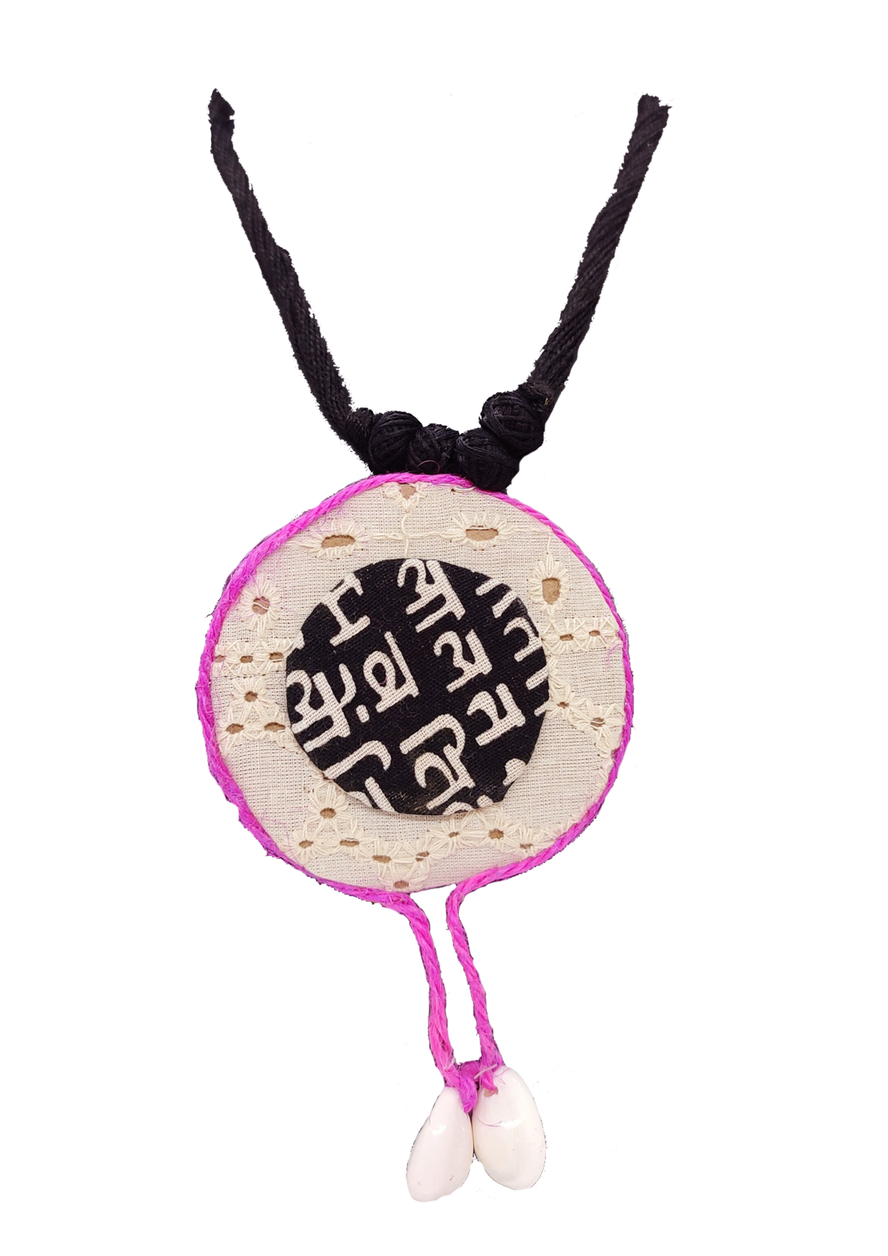 The necklace gracefully drapes around your neck, showcasing the captivating Ajrakh motifs in a vibrant multicolour palette. Each shell accent is carefully placed, adding a touch of natural elegance and texture to the ensemble.
