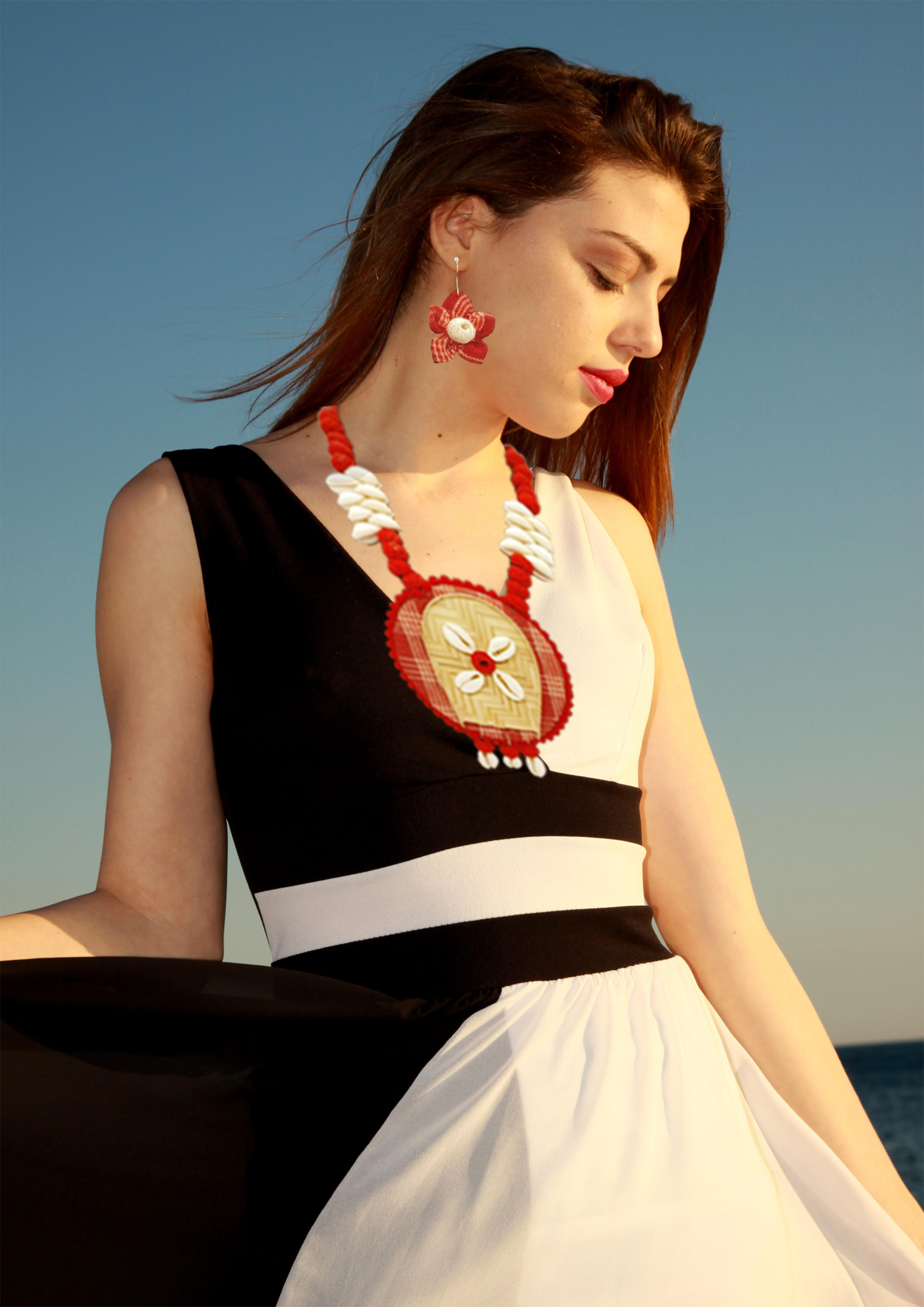 The necklace drapes gracefully, embracing your neckline with a blend of cultural significance and contemporary style. The coordinating earrings complement the set, framing your face with a touch of sophistication.