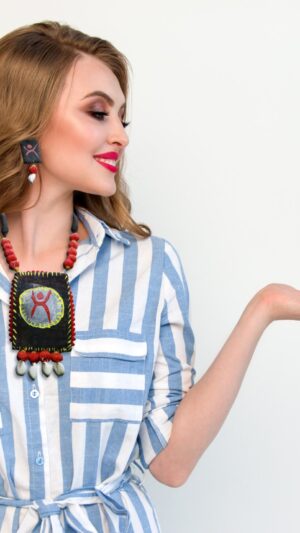 The necklace and earrings are thoughtfully coordinated, resulting in a set that seamlessly blends style with spiritual symbolism. Each piece is adorned with intricate shell work, enhancing the ensemble with texture and elegance.